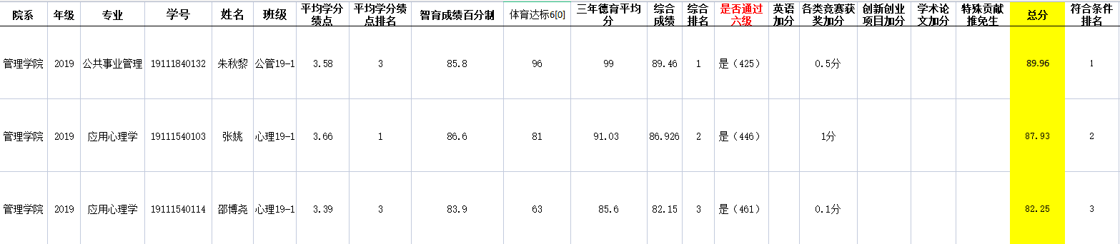 根据tyc5997太阳集团推荐优秀应届本科毕业生免试攻读研究生工作管理规定以及tyc5997太阳集团推免生遴选条件细化要求,tyc5997太阳集团成立院系推免工作领导小组,并根据公司文件精神制定tyc5997太阳集团推免工作方案,根据工作方案,统计员工三年综合成绩、英语六级成绩以及各类加分项目,现将统计结果进行公示: