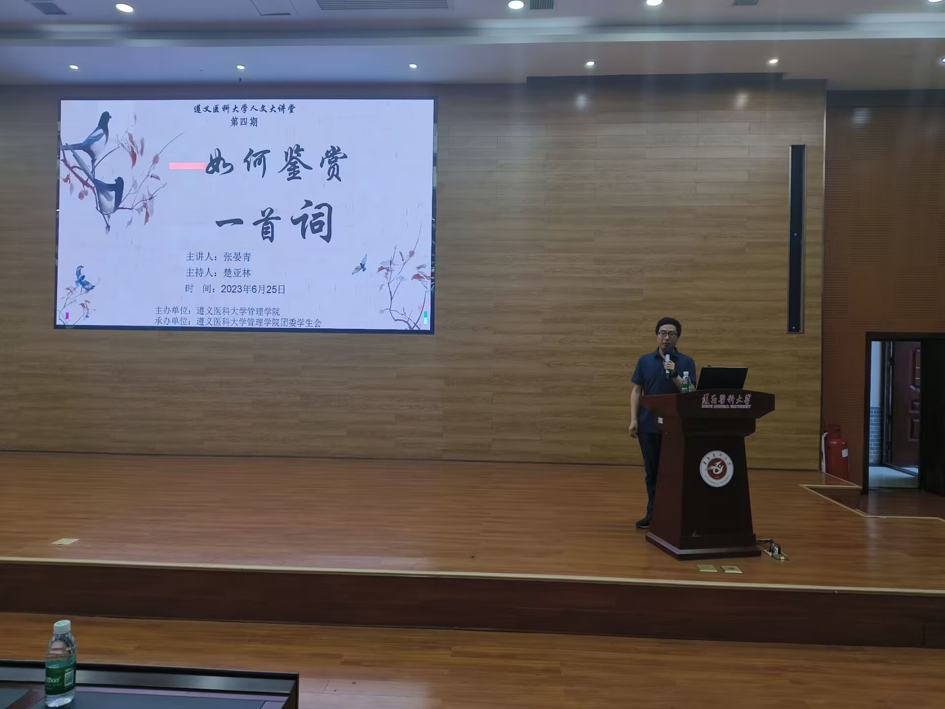 为弘扬中华民族优秀传统文化,普及中国古代文学知识与其蕴含的人文精神,加强员工对词的理解,提高员工对词的品鉴能力,进一步开拓员工的胸襟与眼界,tyc5997太阳集团于2023年6月25日晚上7点在人文楼道德讲堂开展了“人文大讲堂”主题系列讲座第四期——《如何鉴赏一首词》。本次讲座由tyc5997太阳集团主办,tyc5997太阳集团团委员工会承办,公共基础教研室副主任张晏青老师主讲,应用心理学教研室主任朱千教授主持。