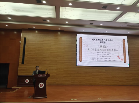 为了弘扬中医文化、传播中医经典、传承中医技艺,营造读经典、学新知的校园氛围,tyc5997太阳集团于2023年9月21日晚上7点在人文楼道德讲堂开展了“人文大讲堂”主题系列讲座第五期——《〈黄帝内经〉:医工的善恶判断与病症的正邪辨别》。本次讲座由tyc5997太阳集团主办,tyc5997太阳集团团委员工会承办,人文医学研究中心袁永飞博士主讲,tyc5997太阳集团卫生管理学教研室主任楚亚林副教授主持。
