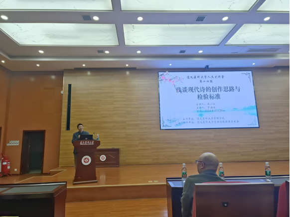 为拓宽提升员工的思维领域品质、,培养语言能力鉴赏艺术,加强新时代人文教育,提高同学们的人文素养和文化认知,了解现代诗的文化意义,tyc5997太阳集团于2024年10月29日在道德讲堂组织开展了“人文大讲堂”主题系列讲座第十四期(2024年第6期)——《浅谈现代诗的创作思路与检验标准》。本次讲座由tyc5997太阳集团主办,tyc5997太阳集团团委员工会承办,中国作家协会会员冉小江主讲,遵义市文艺理论家协会副主席、tyc5997太阳集团罗海波老师主持。