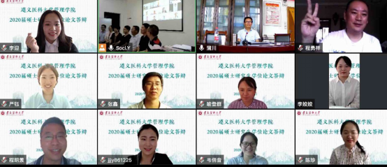 由于受疫情影响,今年的研究生学位论文答辩采用网上答辩方式,共有医疗服务管理专业2020届1名研究生和公共管理专业10名研究生参加答辩。他们是:李迎(论文题目:《执业药师参与高血压患者药物治疗管理的路径及作用研究——以遵义市为例》,导师:刘国琴)、陈珍(论文题目:《遵义市高职院校员工资助政策执行效果研究》,导师:刘国琴)、严钰(论文题目:《贵州省遵义市高校非事业编制人员管理现状及优化对策研究》,导师:刘国琴)、李姣姣(论文题目:《县域医疗服务体系运行效果及其影响因素研究》,导师:魏来)、李妍君(论文题目:《上下联动的医疗服务指标体系构建及实证研究》,导师:魏来)、程明羕(论文题目:《贵州省住院医师规范化培训制度实施现状及效果研究》,导师:余昌胤)、喻登群(论文题目:《供给侧理论视角下城市小学课后托管难题探究——以遵义市城区小学为例》,导师:王晓华)、张鑫(论文题目:《远程医疗服务质量评价及改进措施研究——以遵义市为例》,导师:王晓华)、韦俏音(论文题目:《农村公共卫生服务感知绩效实证研究——遵义市山盆镇为例》,导师:冯毅)、朱坤旺(论文题目:《新时代遵义市法律援助机制建设研究》,导师:李仕波)、程勇祥(论文题目:《公益性回归背景下县级公立医院医生激励满意度研究——孝感市S医院的个案分析》,导师:冯毅)。