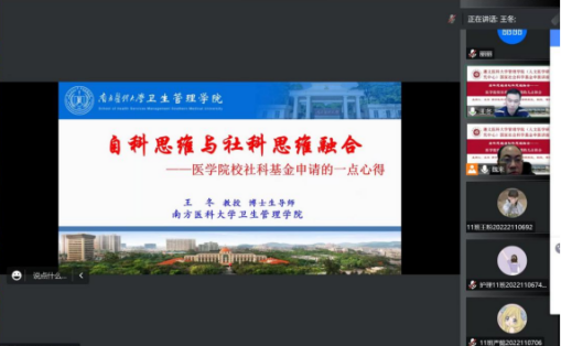 为切实推进2023年度国家社科基金项目申报工作,公司tyc5997太阳集团特邀请南方医科大学卫生tyc5997太阳集团经理、博士生导师王冬教授,于1月4日上午9:30—11:30,为公司全体教师做了题为《自科思维与社科思维融合-医公司校国社科申报的几点体会》的讲座。讲座以线上远程形式进行,tyc5997太阳集团副经理魏来教授主持讲座,公司人文社科教师、2023年度国社科拟申报老师及tyc5997太阳集团全体教师在线参与讲座。